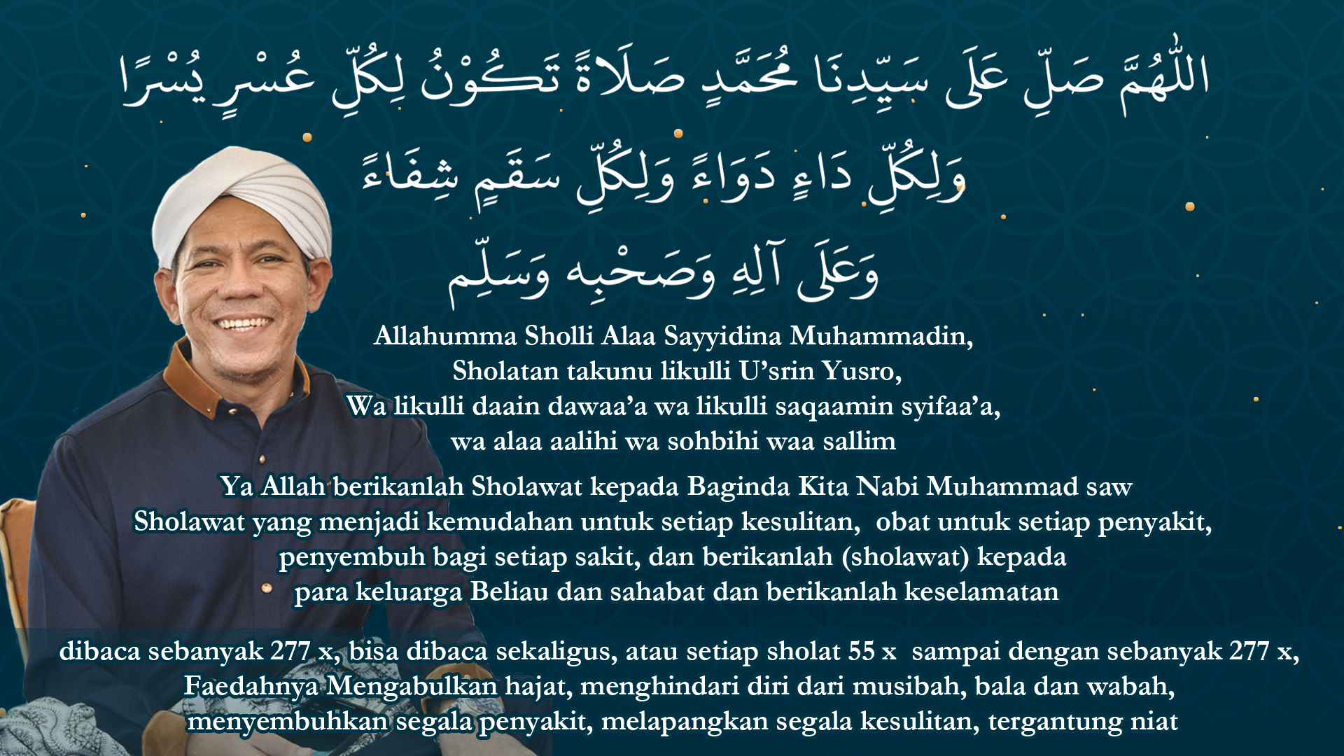 Allahumma Sholli Alaa Sayyidina Muhammadin, Sholatan takunu likulli U’srin Yusro, Wa likulli daain dawaa’a wa likulli saqaamin syifaa’a, wa alaa aalihi wa sohbihi waa sallim.